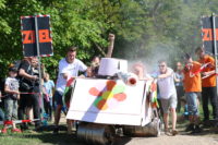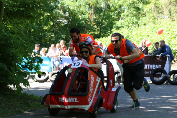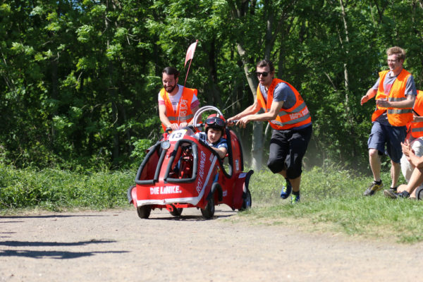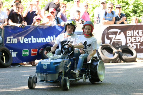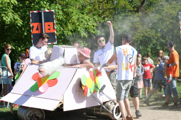 Während sich die meisten Teams in den klassischen sportlichen Disziplinen „Massenstart“ (bergauf), „Zeitfah-ren“ (einmal ums Plateau) und „Abfahrt“ heiße Kopf-an-Kopf-Rennen lieferten – über die Plätze auf dem Sie-gertreppchen entschieden nur Sekunden – haben die Teilnehmer der Ingenieurliga D „HTWK“ und „Ingenieure ohne Grenzen“ wieder einmal bewiesen, dass man auch binnen 4 Stunden eine fahrtaugliche Seifenkiste bauen kann. Live vor Ort konnten die Zuschauer den Erfindungsreichtum und das handwerkliche Geschick der zwei Teams bewundern. Dem Ideal der „Materialisierung einer Idee“ kam schließlich der Konfetti verschießende, Joint-kanonige Friedenspanzer von der HTWK am nächsten.